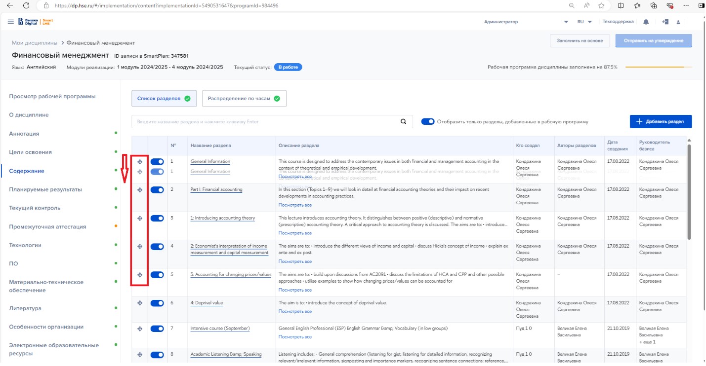 . Для изменения порядкового номера раздела необходимо зажать значок перемещения и переместить курсор на нужную позицию.