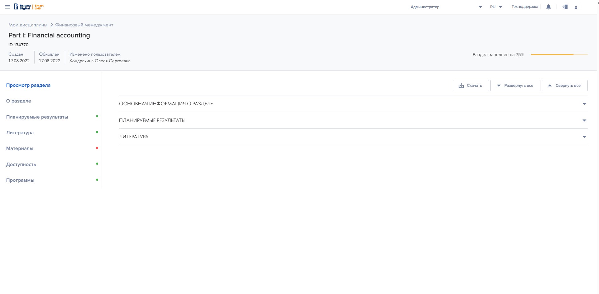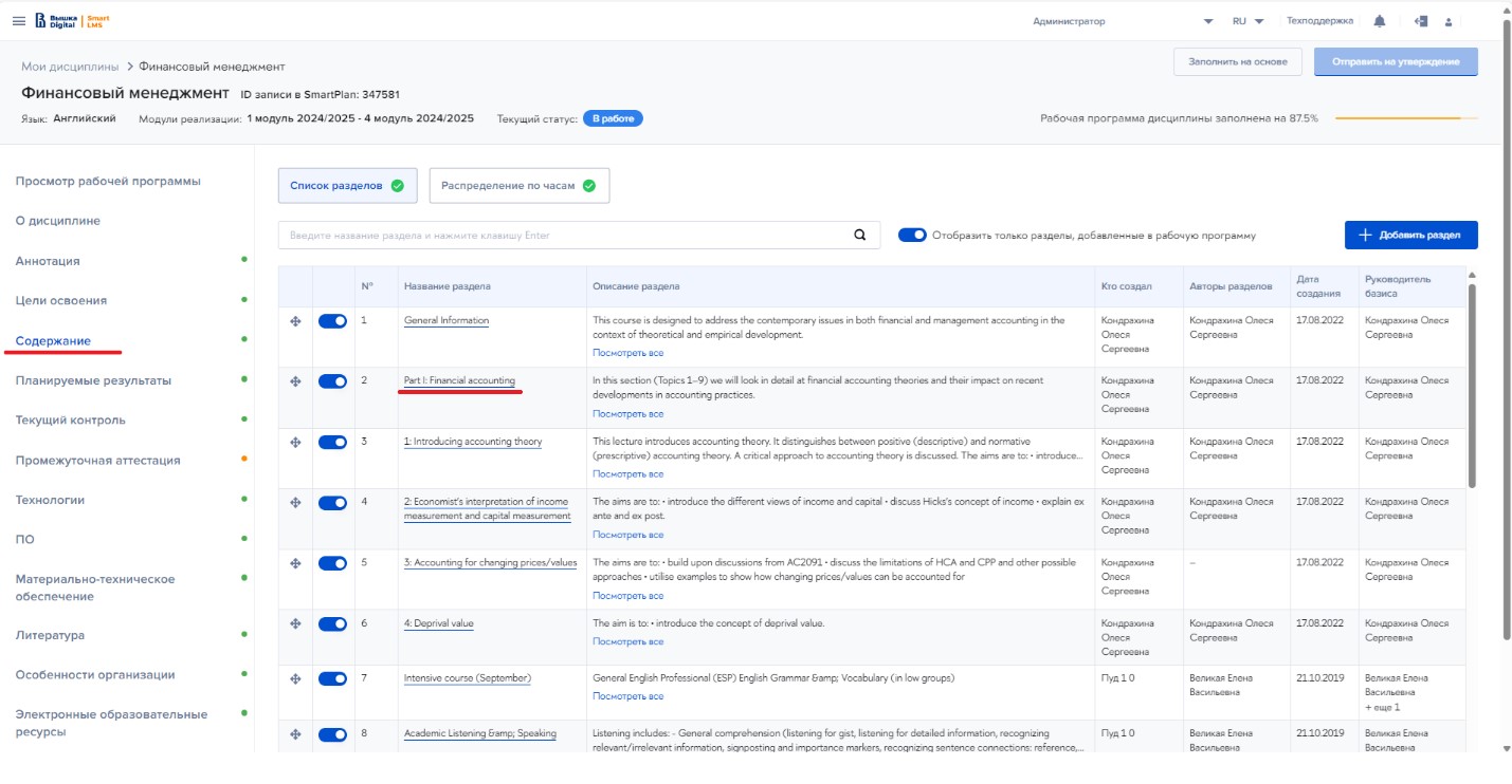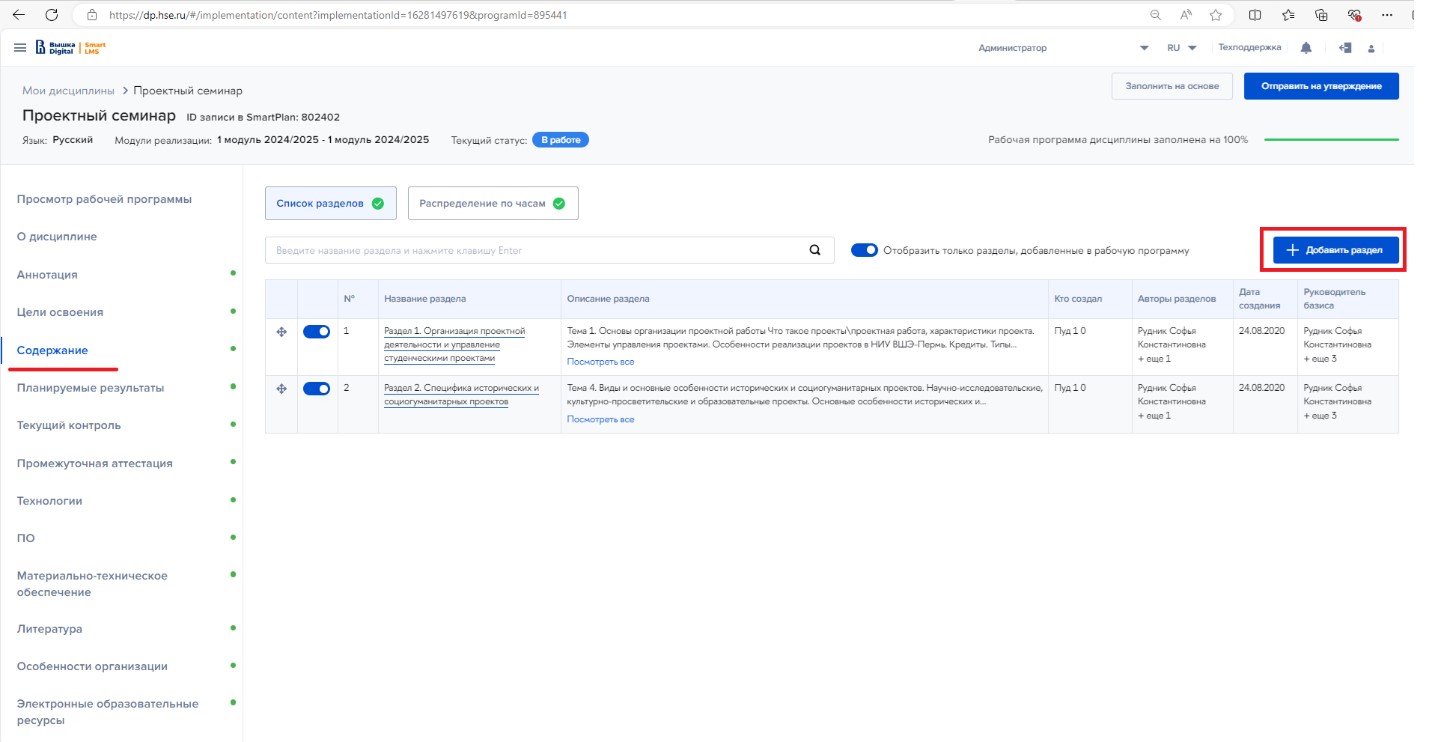 Если связанная программа заполнена и не требует внесения изменений на уровне программы (аннотация, цели освоения), необходимо приступить к добавлению разделов в рабочую программу дисциплины.
