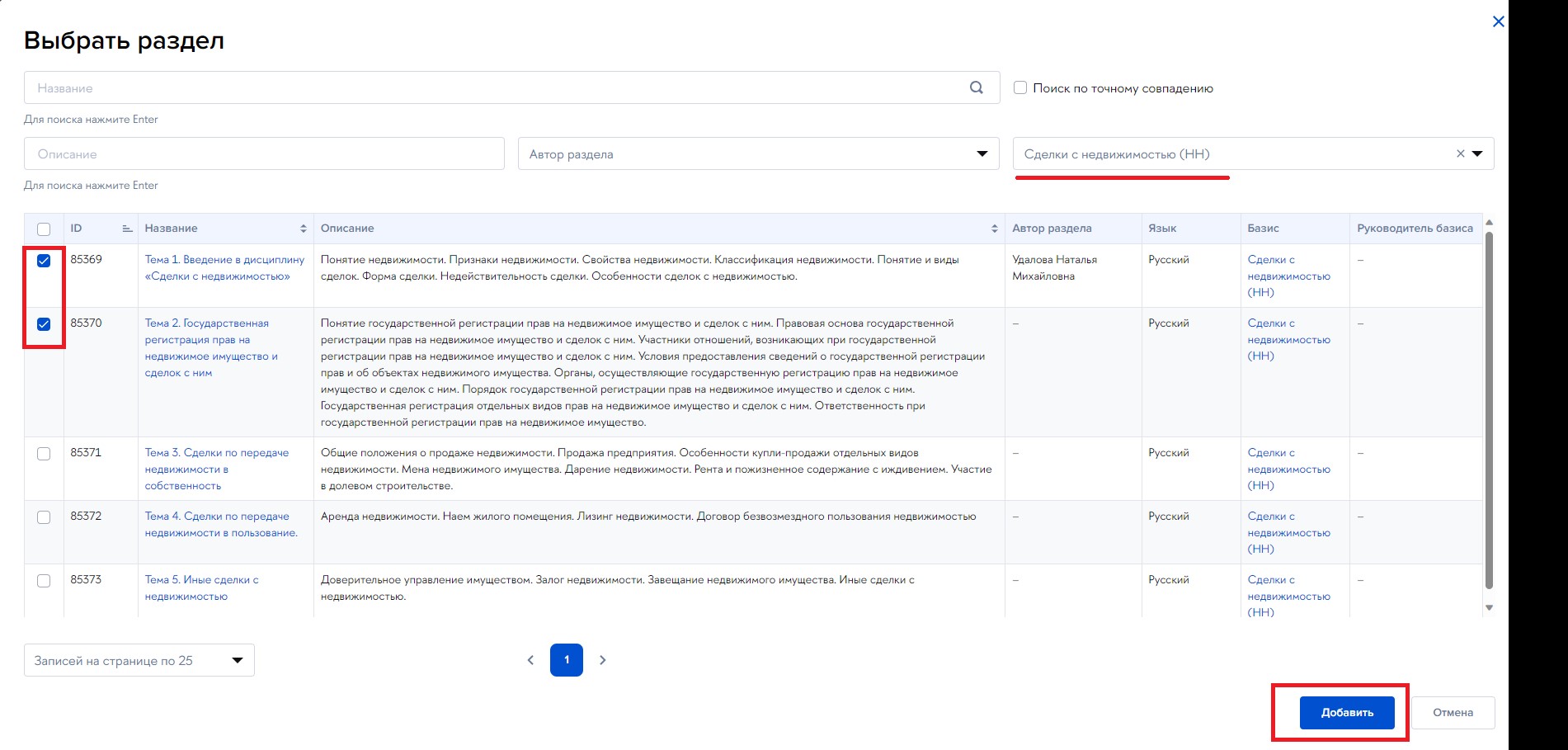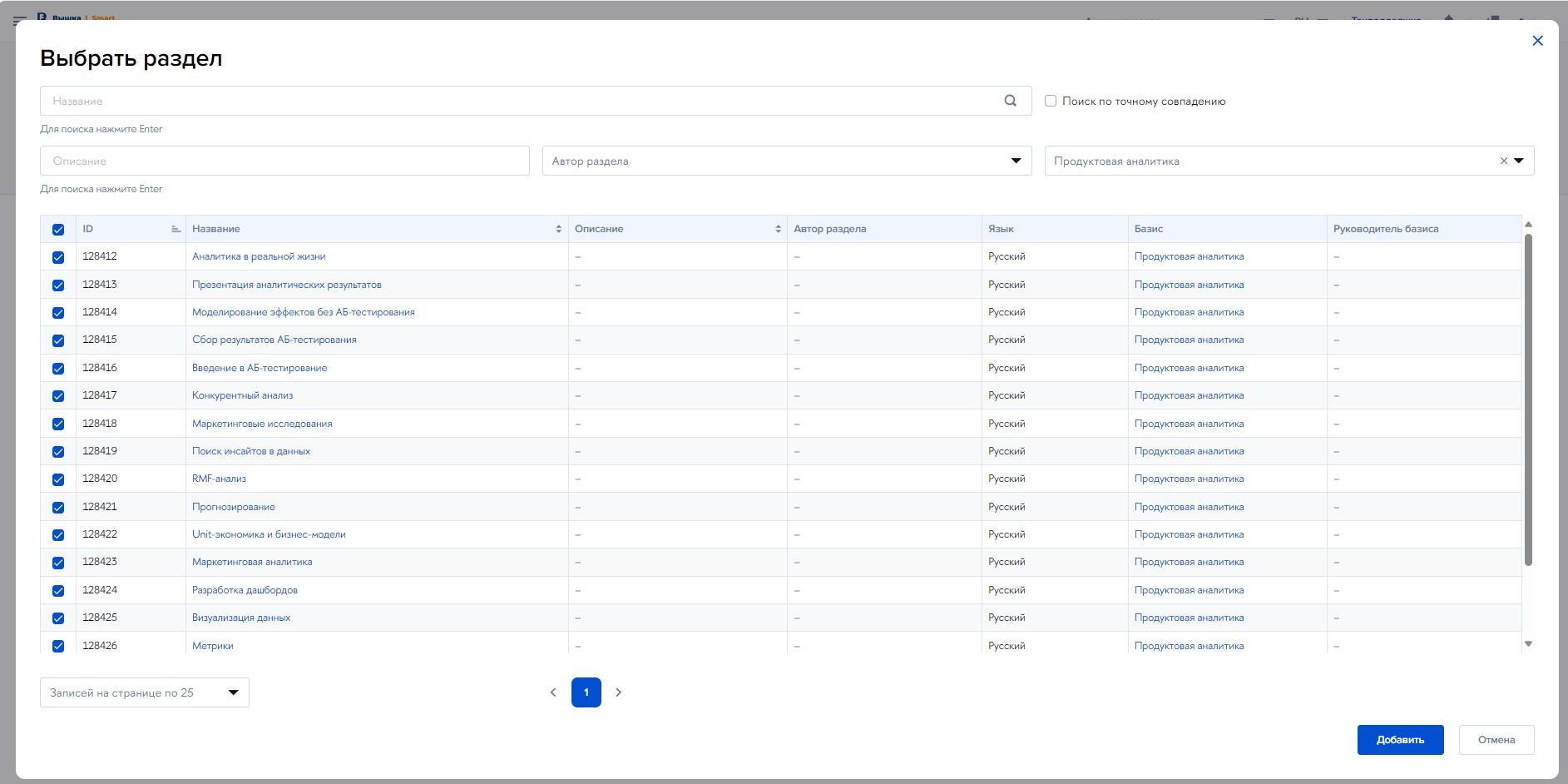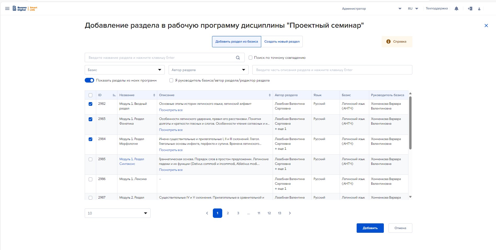 У пользователя будет возможность добавить уже созданный раздел из предложенных базисов или «моих программ» либо создать новый. При добавлении существующих в базисе разделов их необходимо выбрать галочками и нажать на кнопку «Добавить».