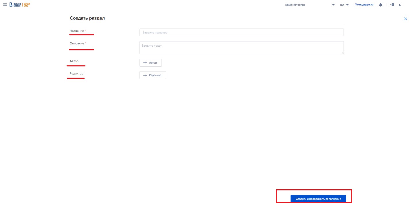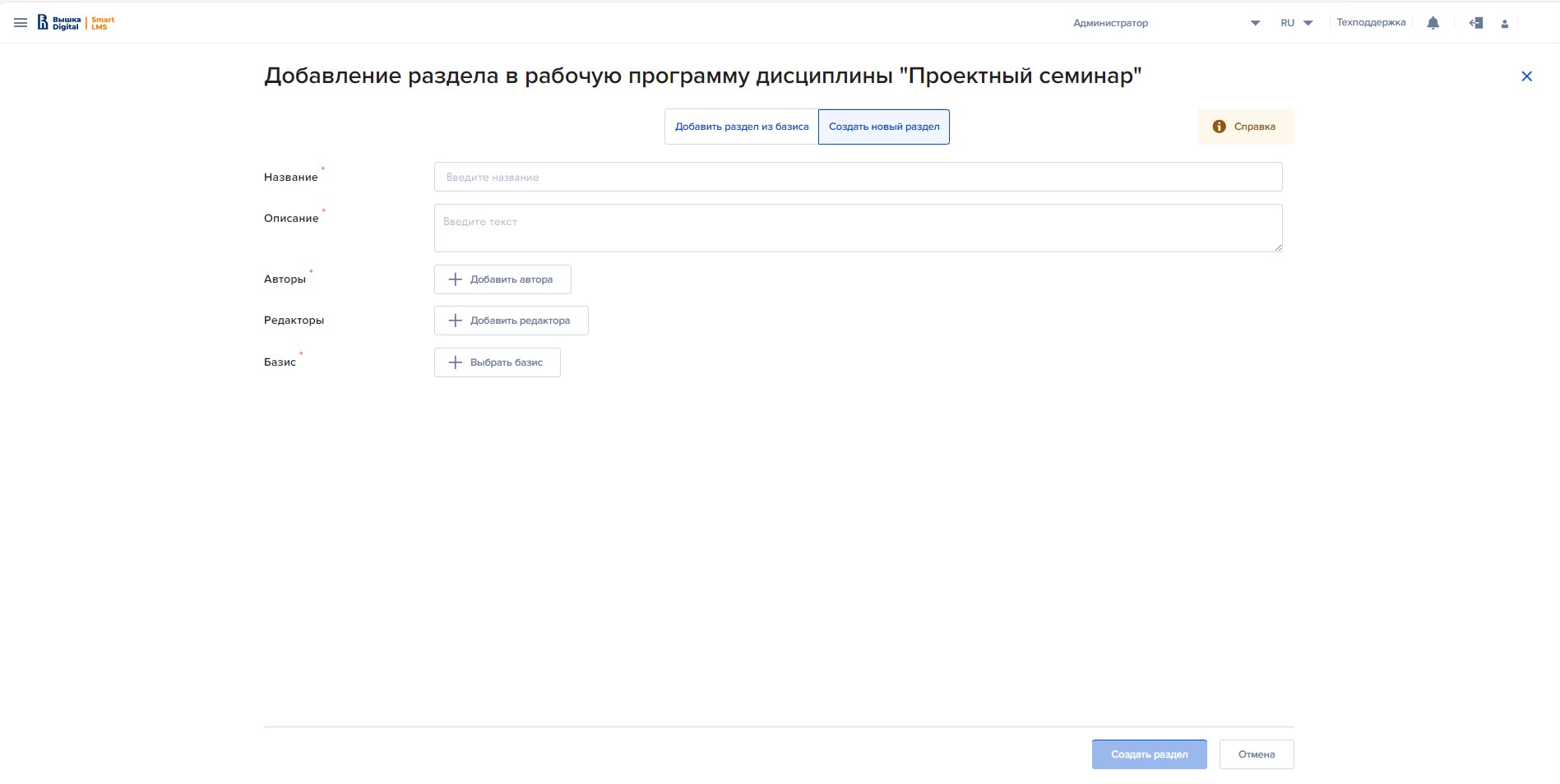 При создании нового раздела необходимо заполнить обязательные поля – название, описание, а также добавить авторов, редакторов (по желанию) и базис, в котором будет храниться раздел. После заполнения полей необходимо нажать на кнопку «Создать раздел».