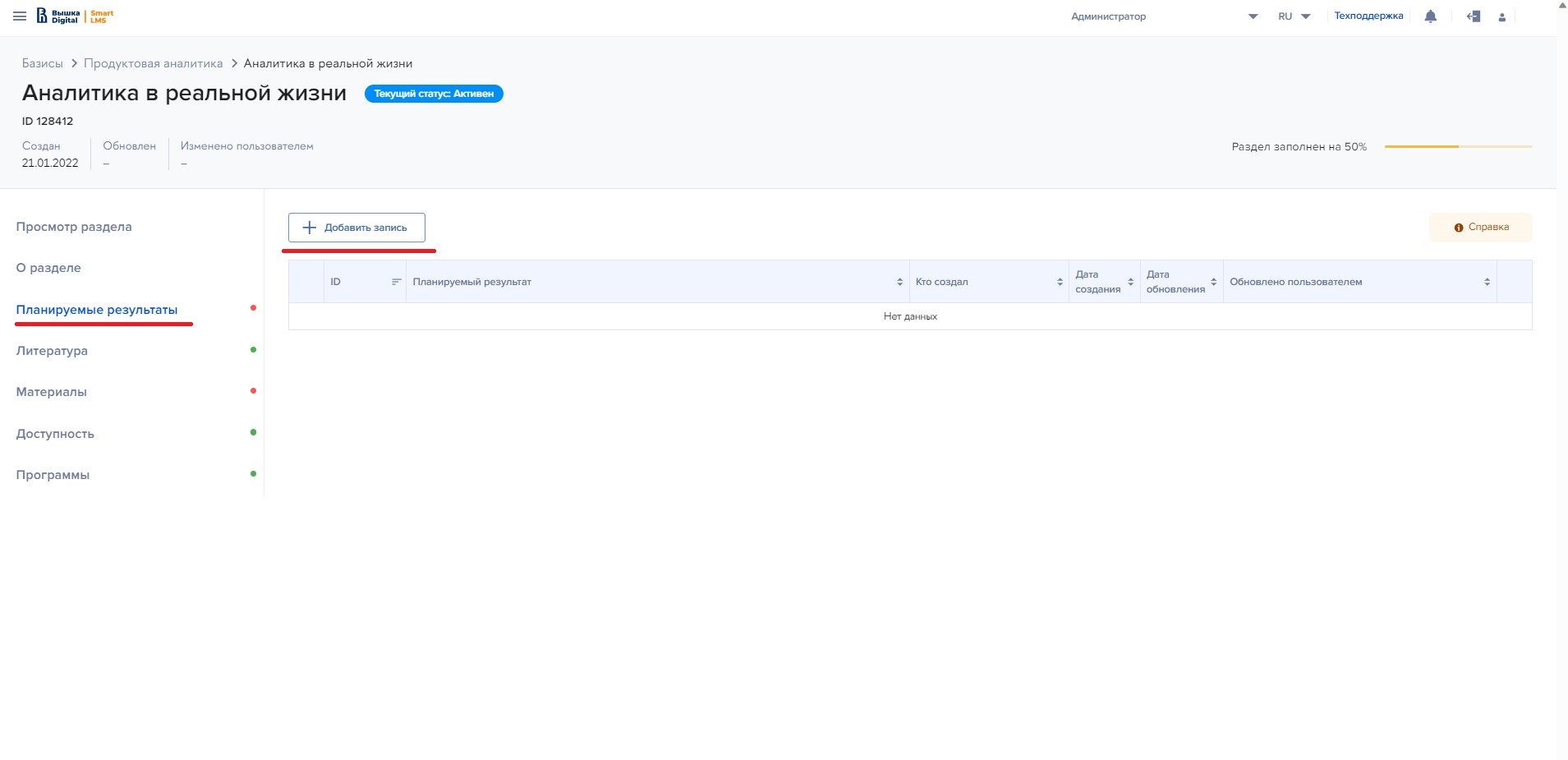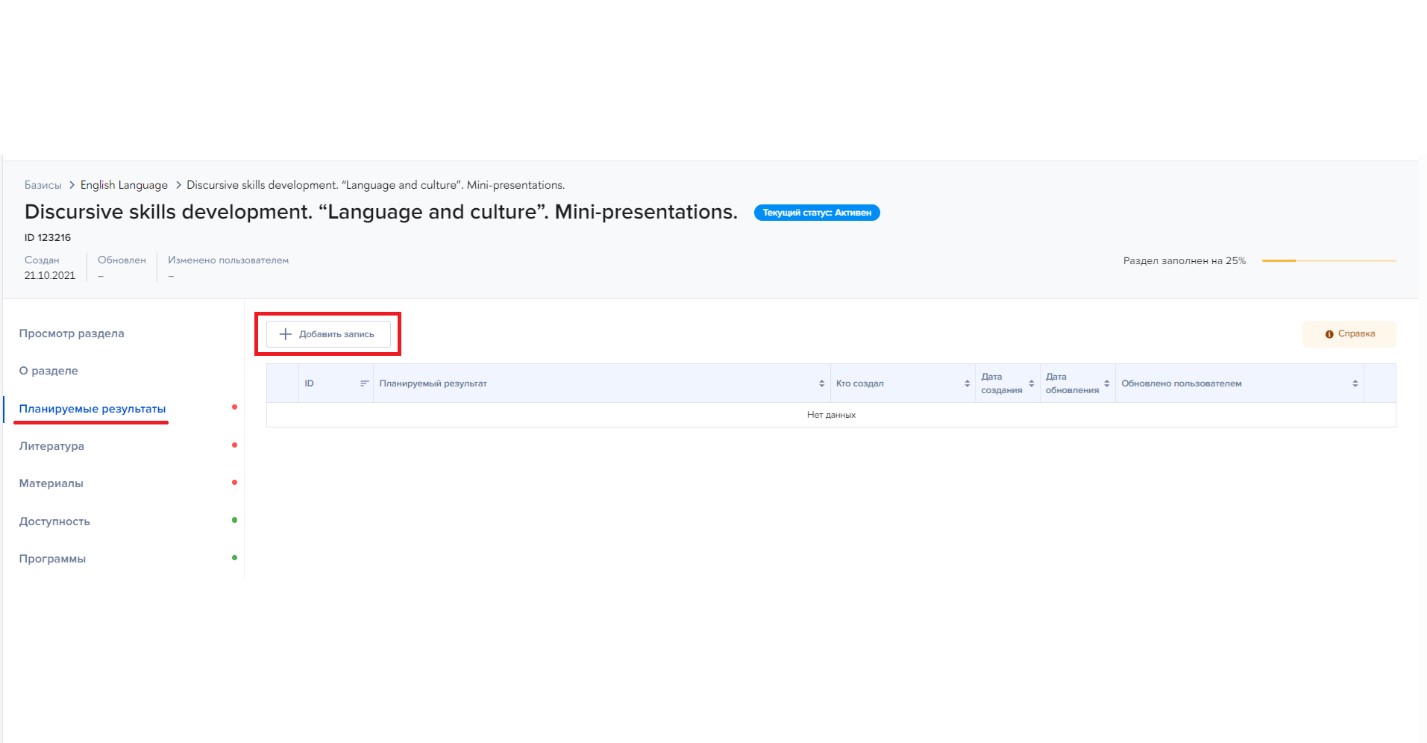 В случае дальнейшего заполнения раздела данными необходимо внести планируемые результаты, литературу и материалы, т.к. раздел новый и в нем еще нет данных. Для этого необходимо перейти в соответствующие блоки и заполнить их.