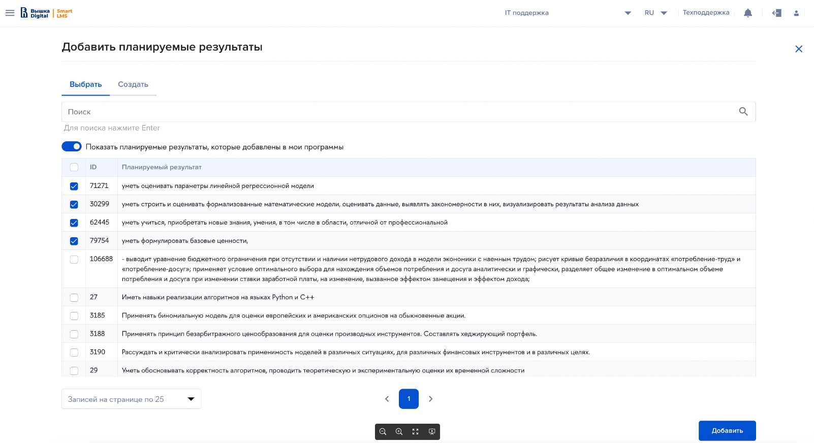 При нажатии на кнопку «Добавить запись» появятся планируемые результаты, которые ранее добавлялись в «Мои программы». Для добавления планируемых результатов необходимо выбрать их галочками и нажать на кнопку «Добавить».