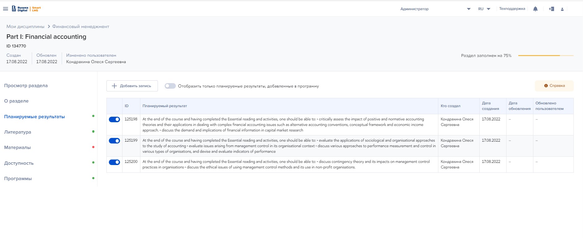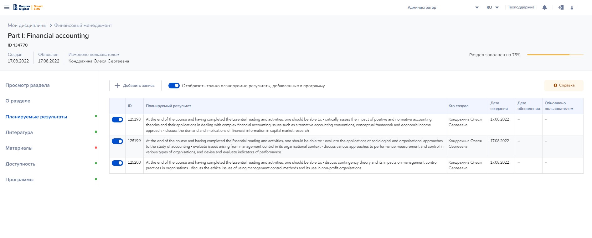 При редактировании планируемых результатов можно отобразить только планируемые результаты, добавленные в программу с помощью переключателя в режиме "включено"