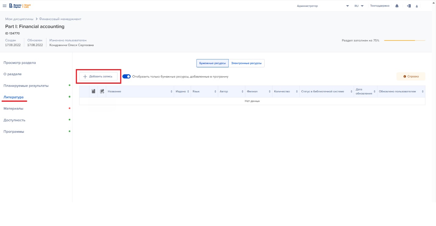 Для добавления литературы необходимо перейти в блок «Литература» слева в меню раздела и добавить бумажный и/или электронный ресурс по кнопке «Добавить запись».