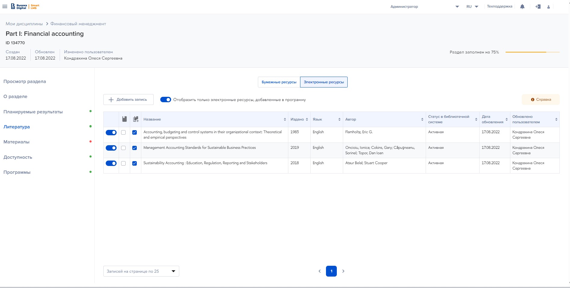 После добавления литературы она отобразится в рабочей программе дисциплины.