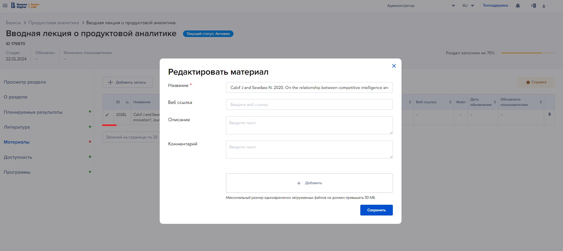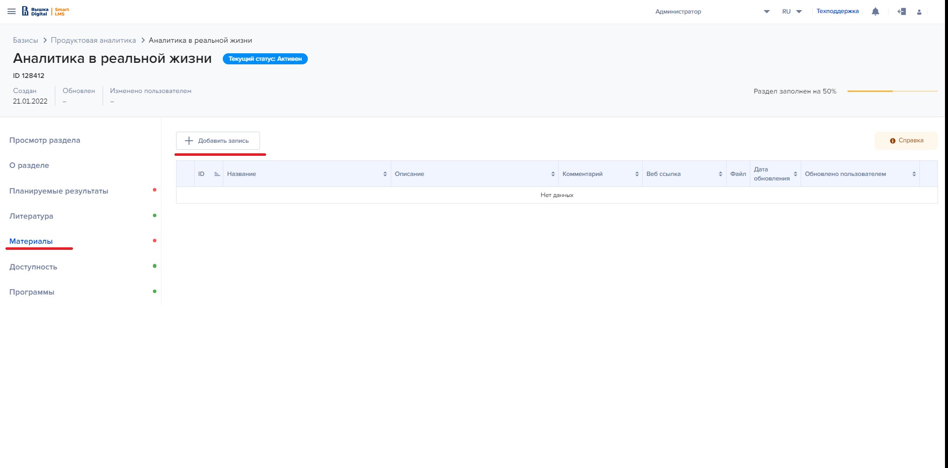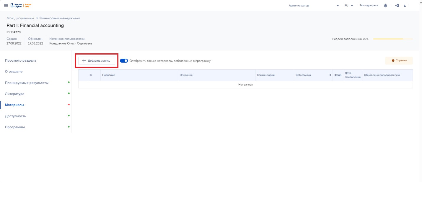Материалы добавляются аналогичным образом. Необходимо перейти в блок «Материалы» слева в меню раздела и нажать на кнопку «Добавить запись».