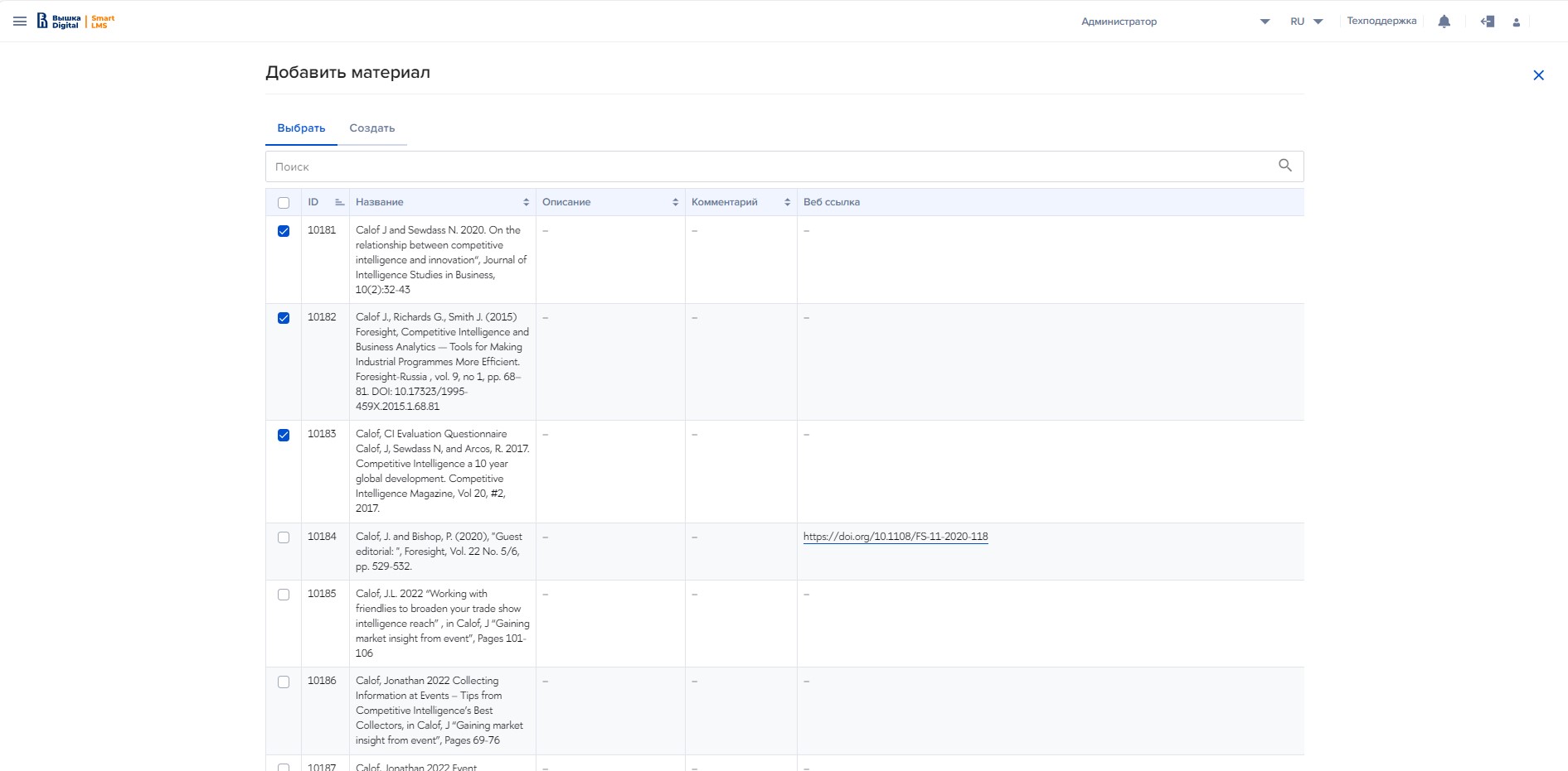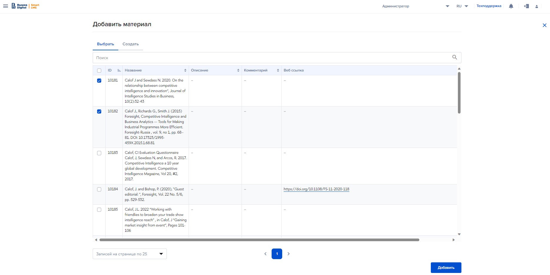 После нажатия на кнопку «Добавить запись» откроется окно с выбором материалов, созданных в системе ранее. Выбрав галочкой необходимые материалы, необходимо нажать на кнопку «Добавить».