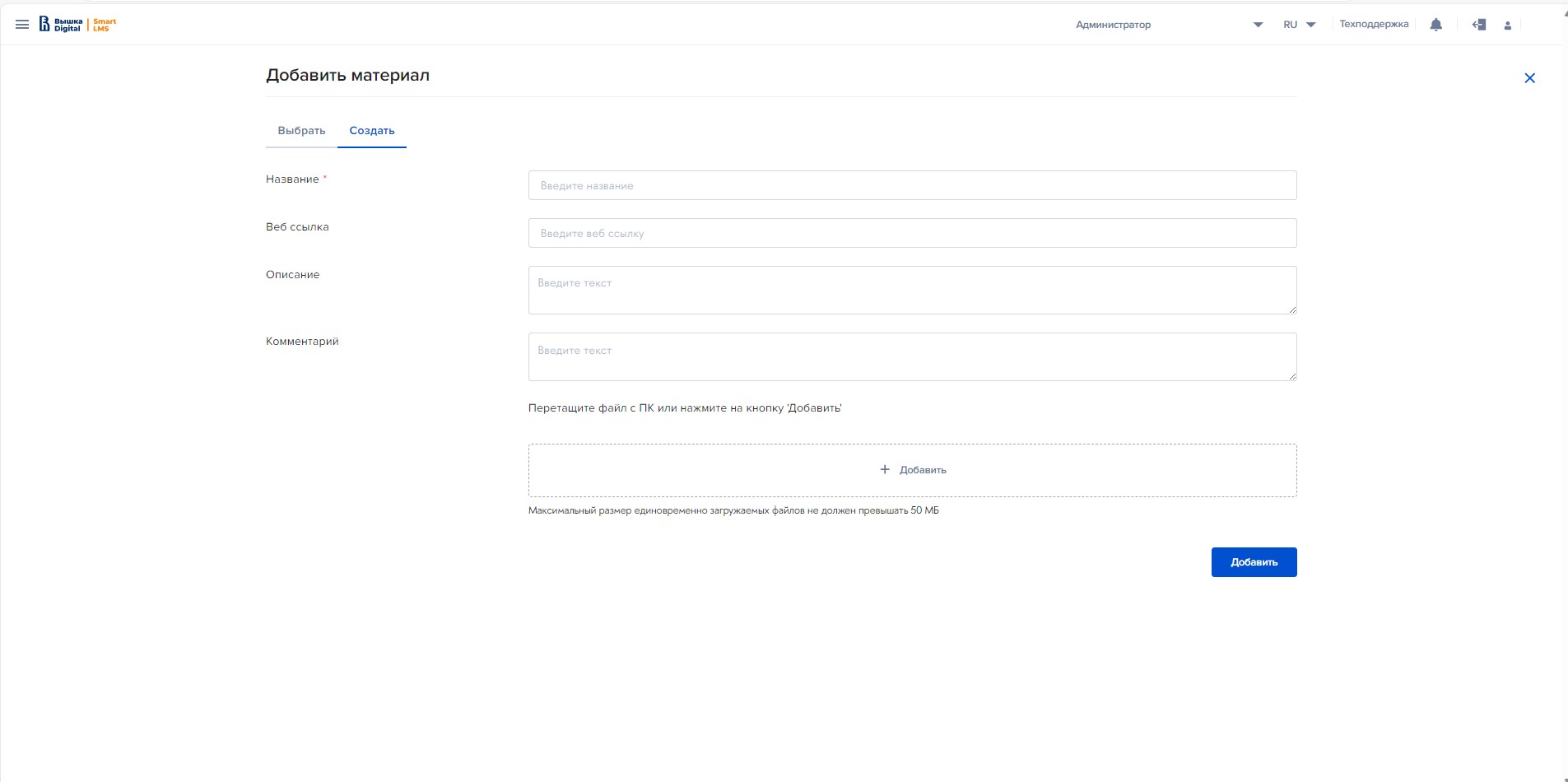 При создании своего материала необходимо заполнить редактируемые поля с названием (обязательное поле), веб-ссылкой, описанием и комментарием. Также страница позволяет прикрепить файл необходимого материала с ПК.