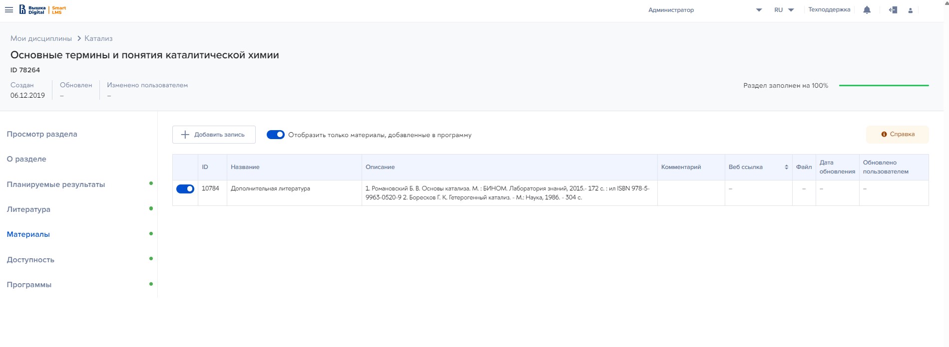 После создания раздела его необходимо наполнить соответствующими планируемыми результатами, литературой и материалами (по желанию).
