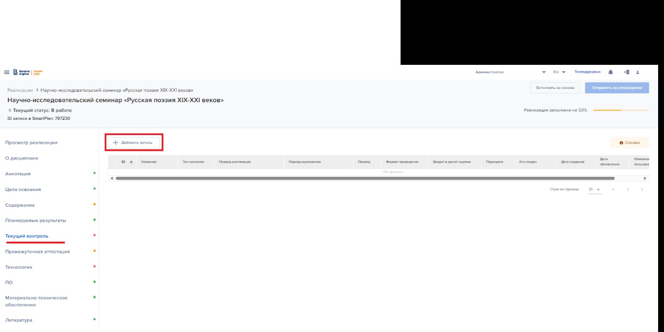 Для создания элемента контроля необходимо перейти в блок «Текущий контроль» и по кнопке «Добавить запись» заполнить необходимые параметры.