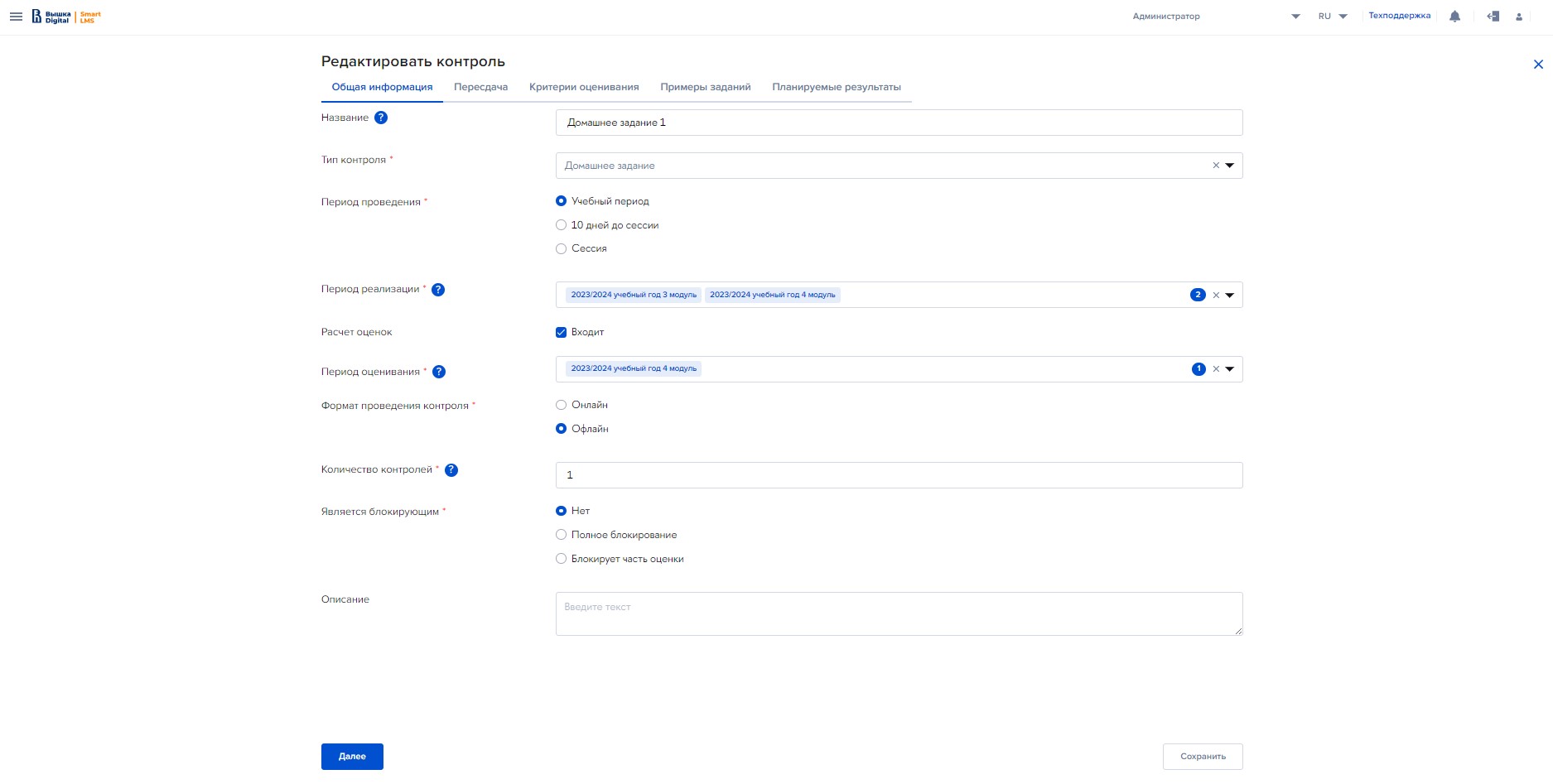 На первой странице с общей информацией необходимо заполнить название элемента контроля, тип контроля, период его проведения и оценивания, формат проведения контроля, количество, описание, а также отметить является ли элемент контроля блокирующим и входит ли он в расчет оценок.