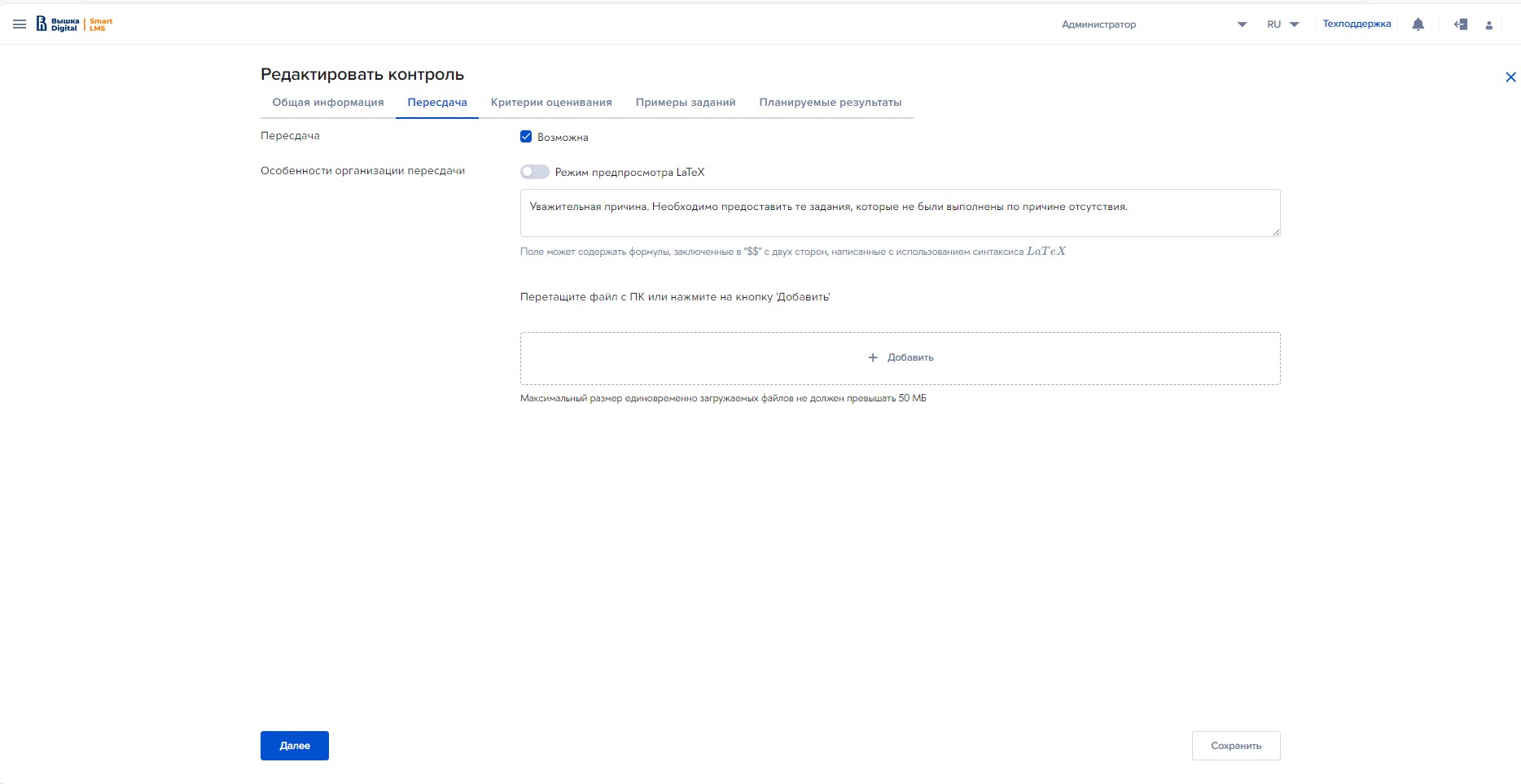 На второй странице заполнения элемента контроля необходимо указать возможность пересдачи и особенности ее организации.