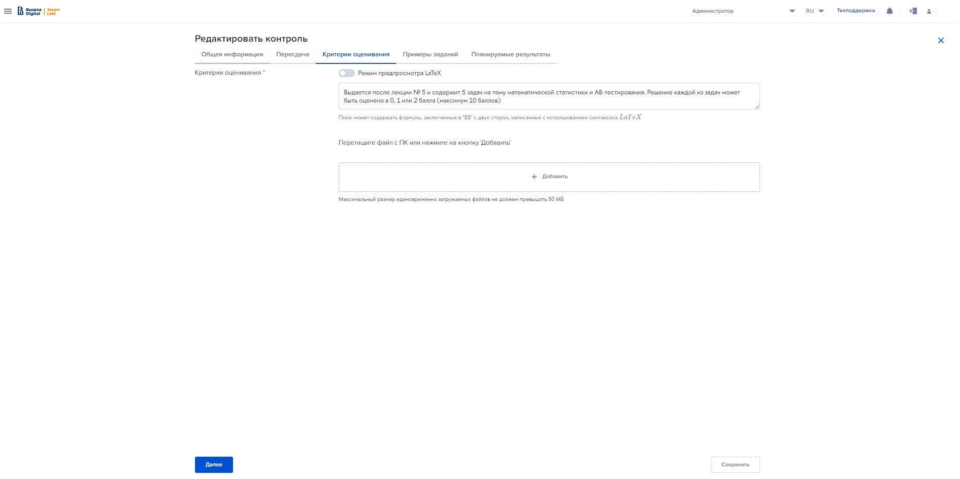 Третья страница заполнения элемента контроля содержит редактируемое поле для описания критериев оценивания и окно, позволяющее добавить файл с ПК.