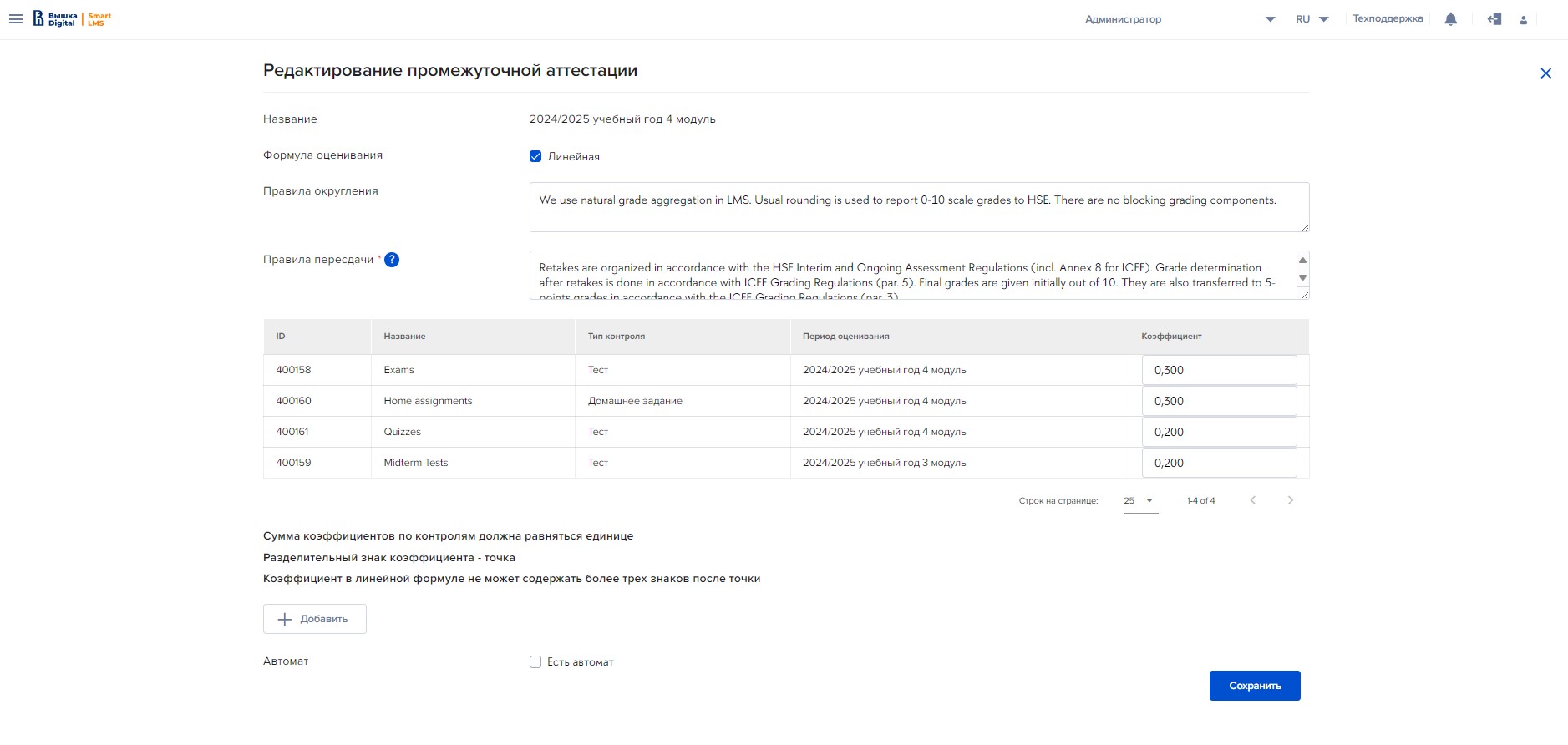 В блоке «Промежуточная аттестация» необходимо заполнить формулу оценивания, правила ее округления, правила пересдачи, коэффициенты по контролям, а также автомат (если есть) и правила его выставления.