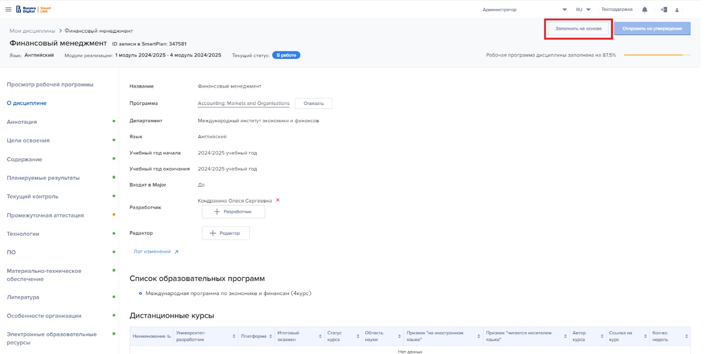 Чтобы заполнить рабочую программу дисциплины на основе другой, необходимо воспользоваться кнопкой «Заполнить на основе».