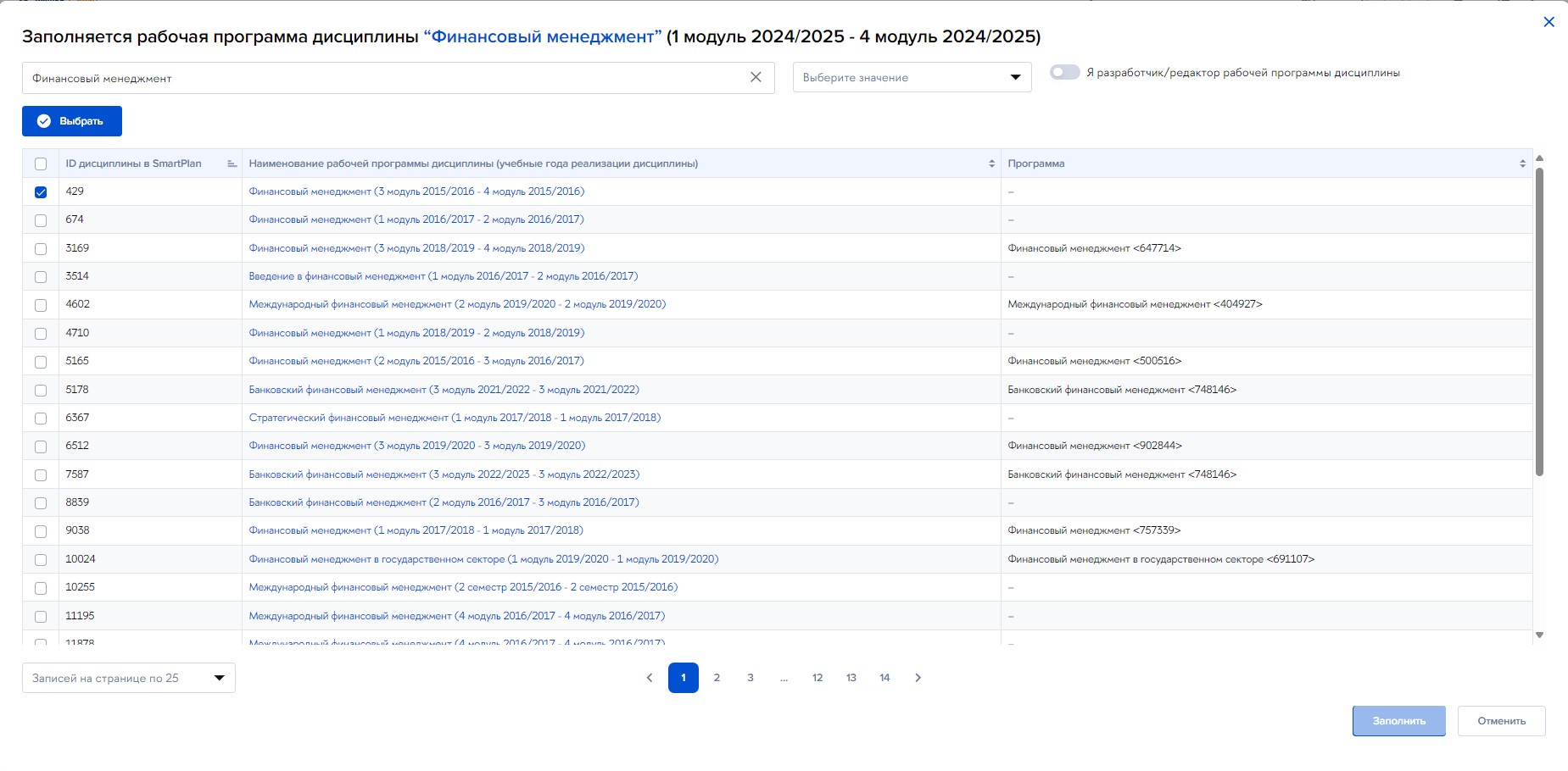 При нажатии на кнопку «Заполнить на основе» появится окно с выбором рабочей программы дисциплины для копировния данных. Поиск можно осуществить по названию, id записи в SmartPlan дисциплины, а также периоду реализации. Также справа от поисковой строки есть возможность отфильтровать рабочие прграммы дисциплин, разработчиком/редактором которых является пользователь. После отметки галочкой нужной рабочей программы дисциплины необходимо нажать на кнопку «Выбрать».