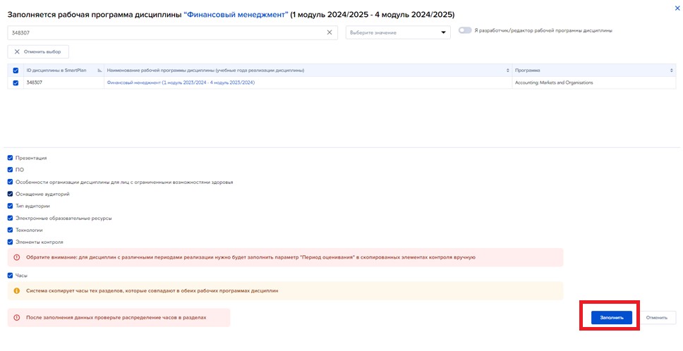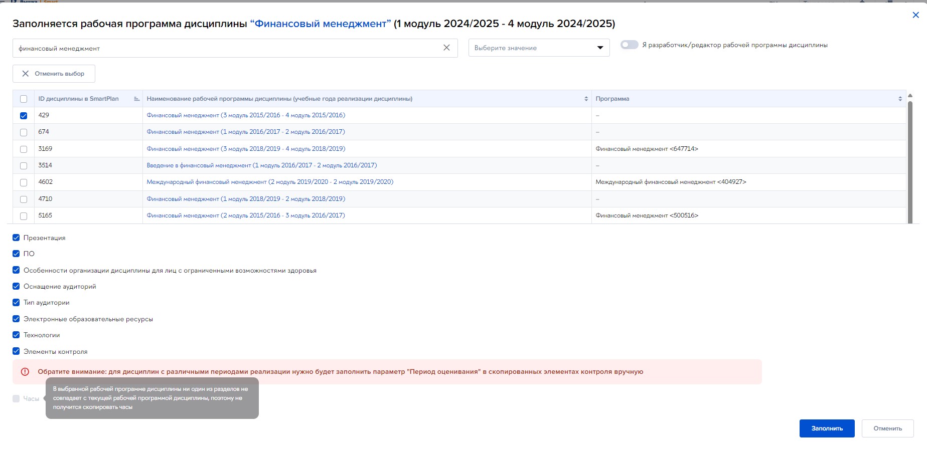 Полсе выбора рабочей программы дисциплины появится окно с копируемыми блоками, которые можно выбрать галочкой.