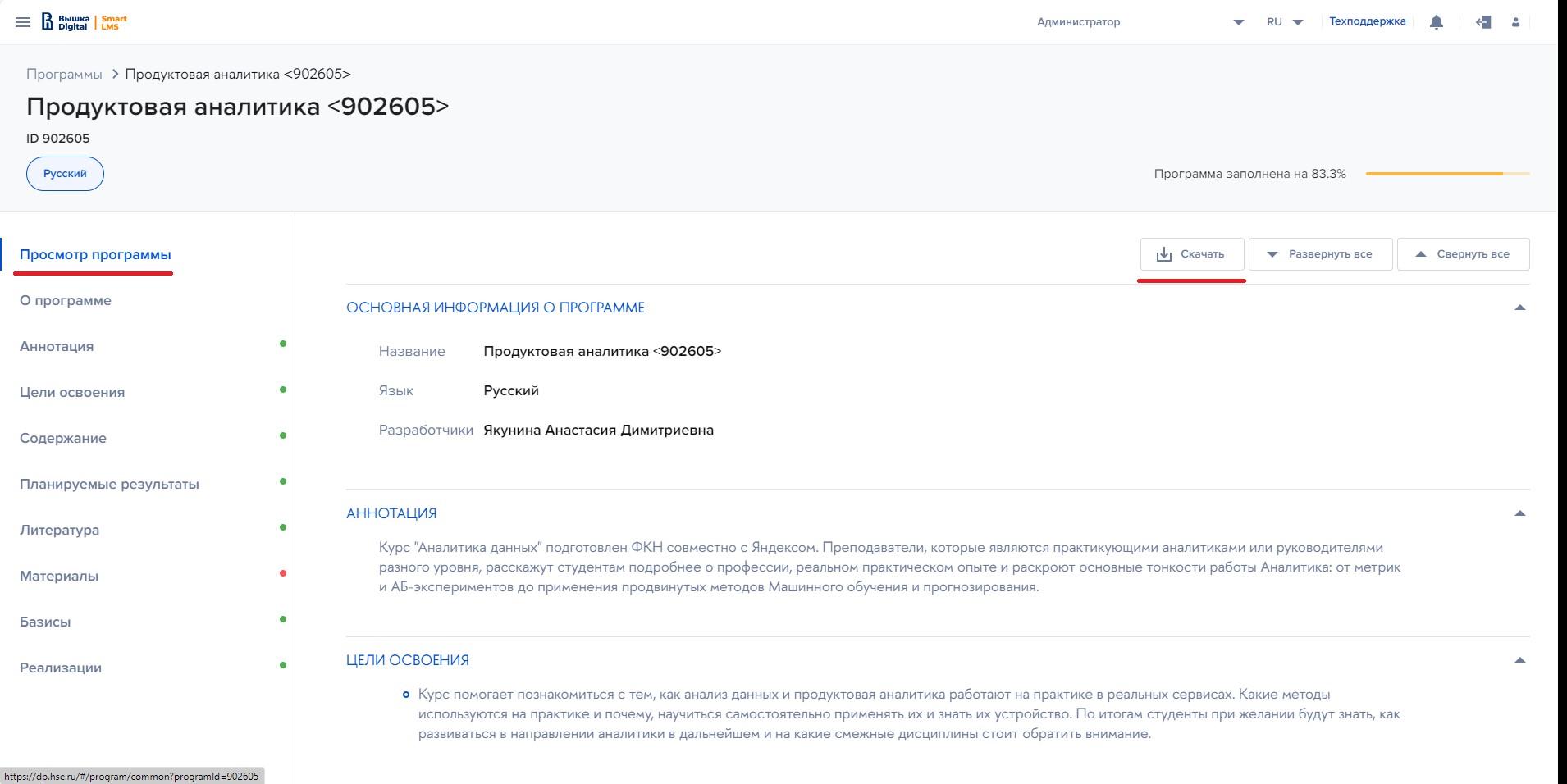 Страница просмотра программы также позволяет скачать ее в формате pdf.
