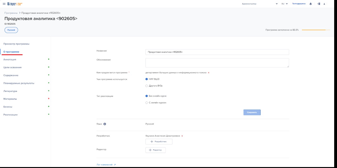 Как правило, за создание программы отвечает менеджер, т.к. он осуществляет связь новой программы с рабочей программой дисциплины для интеграции аннотации в SmartPlan. Он же назначает пользователя разработчиком или редактором программы, который отвечает за наполнение программы. Поэтому чаще всего рабочая программа дисциплины уже связана с программой, и разработчику остается заполнить или отредактировать ее в соответствии с актуальными данными.