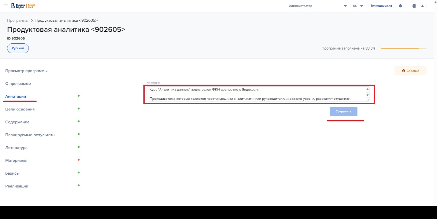 Вносить актуальную аннотацию или корректировать существующую необходимо в блоке «Аннотация» в редактируемом поле.