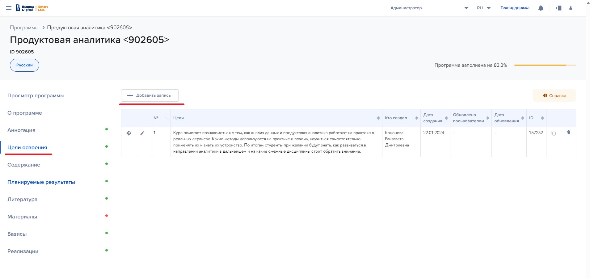 Цели освоения заполняются в одноименном блоке «Цели освоения». По кнопке «Добавить запись» необходимо заполнить редактируемое поле, затем добавить созданную цель освоения в программу.