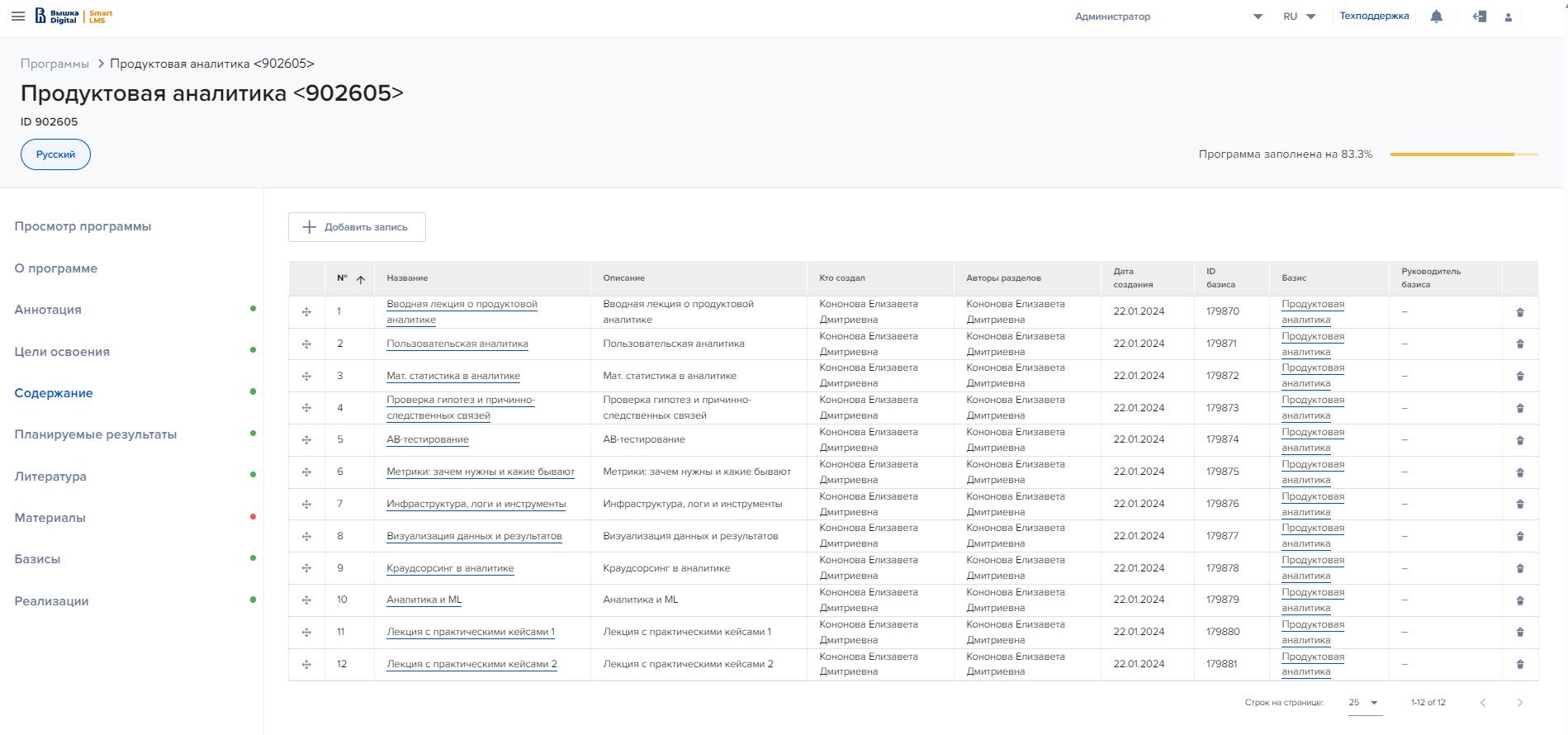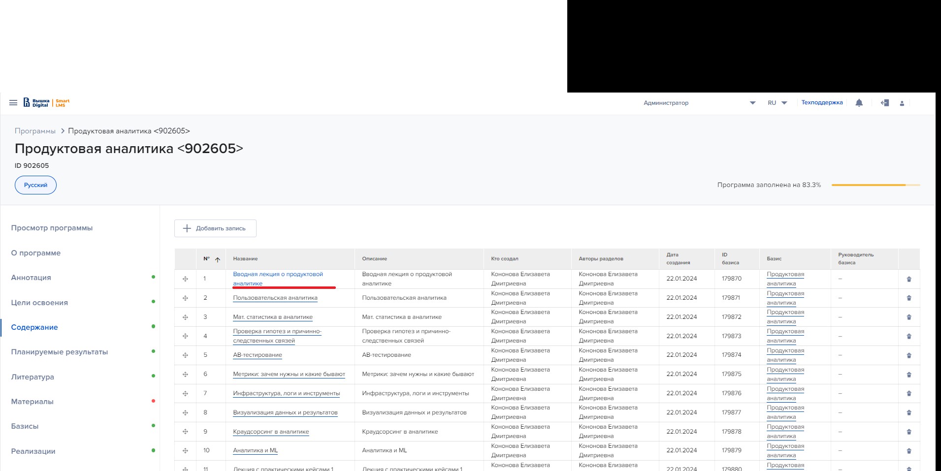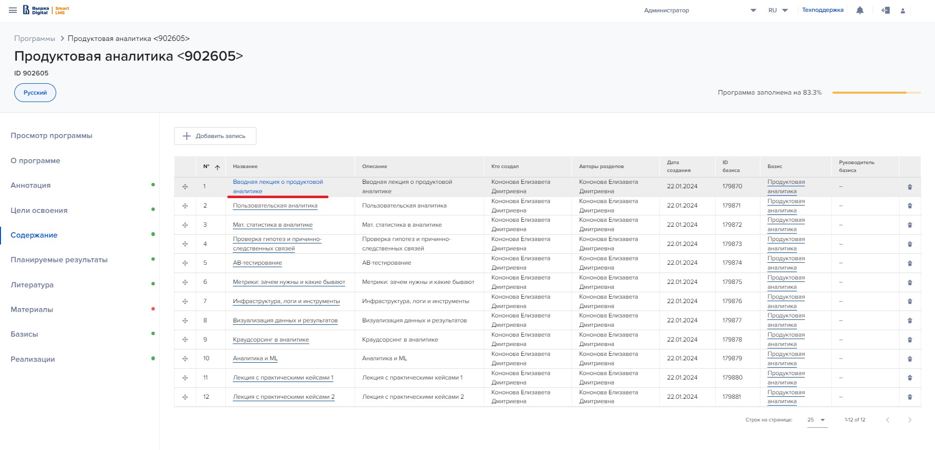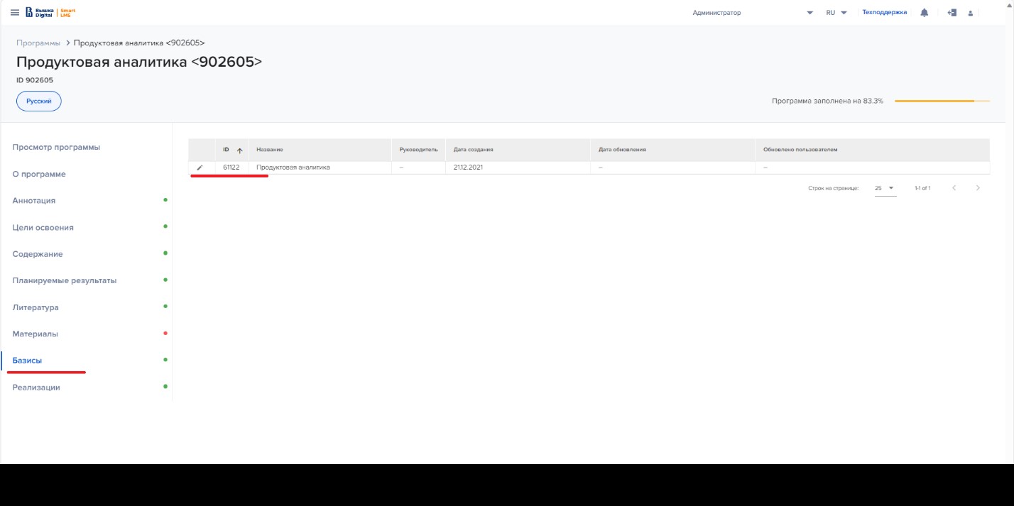 При необходимости внесения изменений в раздел содержания следует перейти в связанный с программой базис. По клику на раздел содержания произойдет переход из программы или рабочей программы дисциплины в базис.