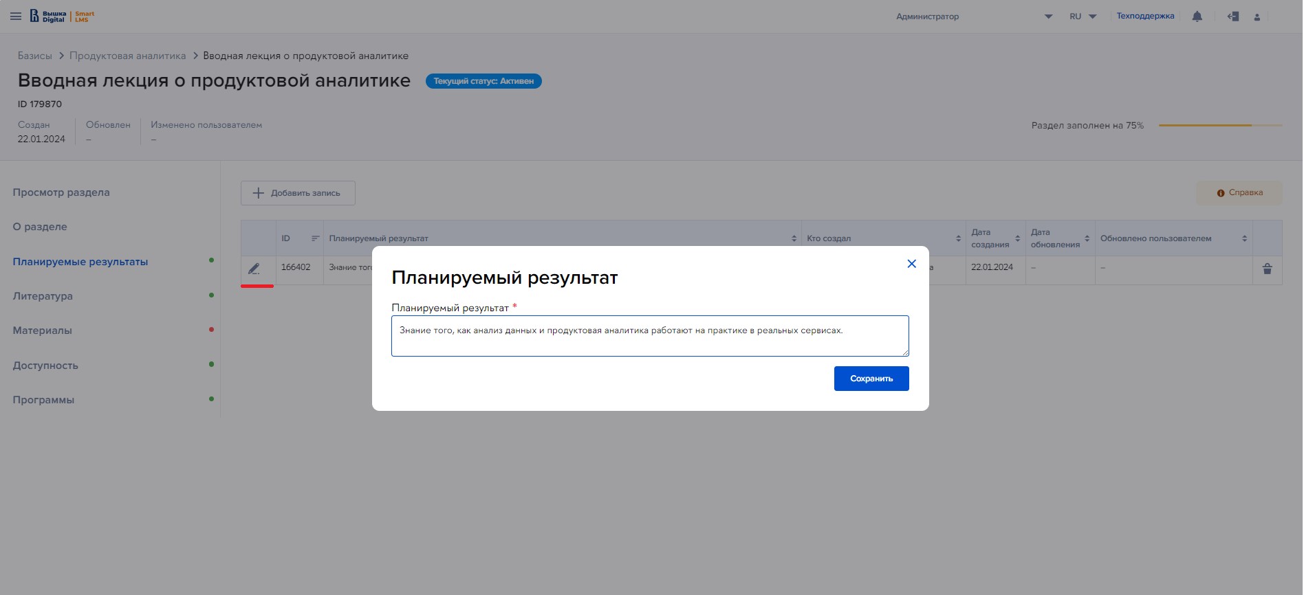 Важно отметить, что редактировать планируемый результат может только тот, кто его изначально создавал.