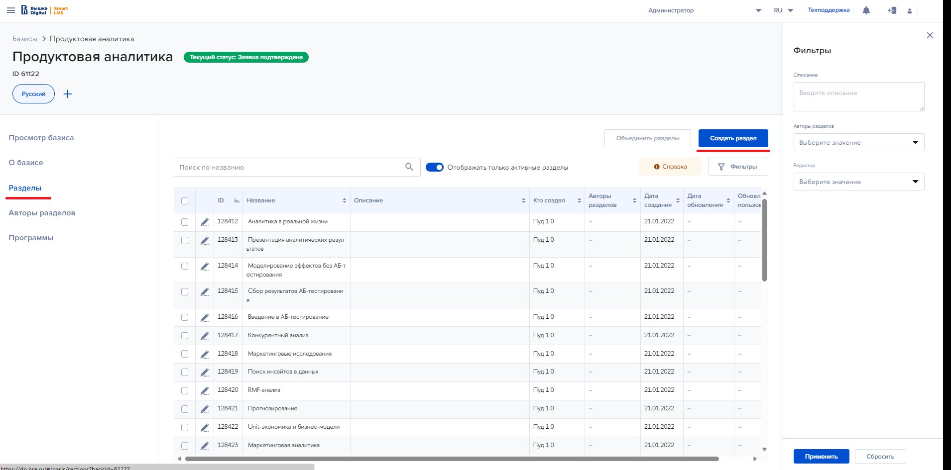Для создания нового раздела следует перейти в связанный базис в блок «Разделы» и нажатием кнопки «Создать раздел» заполнить окно с редактируемыми полями «Название» и «Описание», а также выбрать авторов и редакторов раздела.