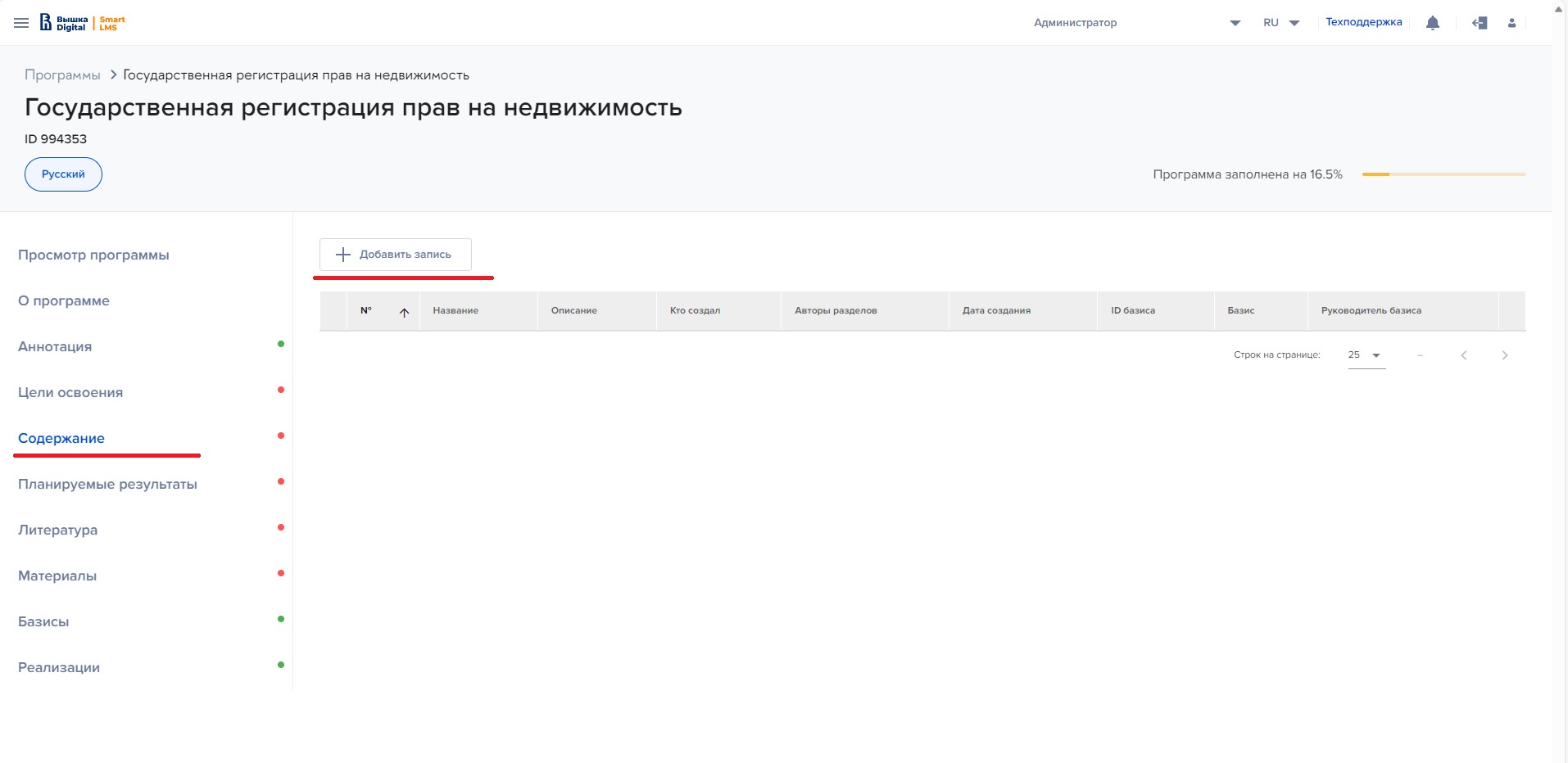 Перейдя в блок «Содержание», необходимо проверить наличие разделов и их актуальность. При необходимости добавления разделов в содержание стоит ознакомиться с уже созданными разделами базисов.