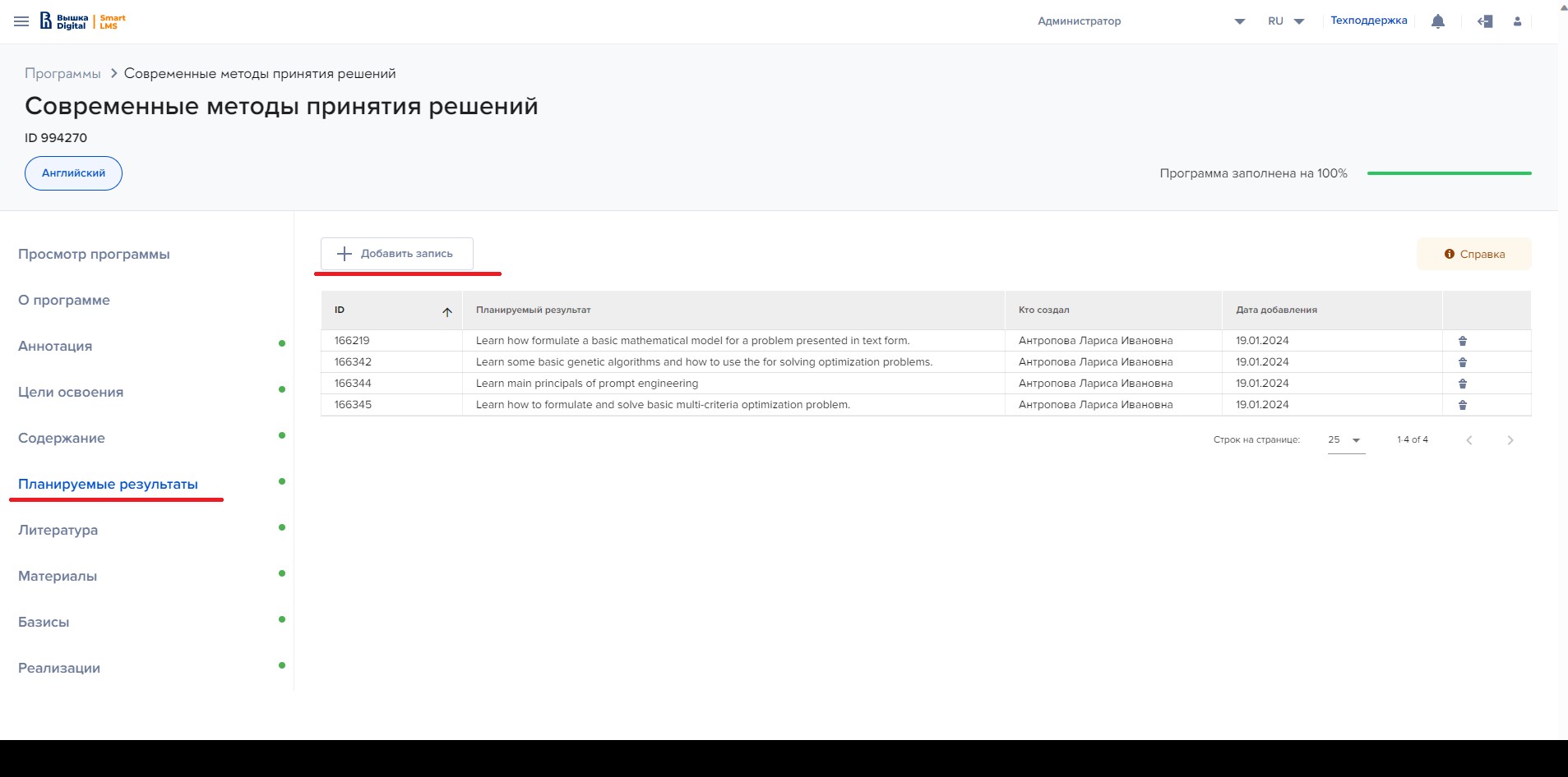 Перейдя в блок «Планируемые результаты», необходимо добавить ПРО по кнопке «Добавить запись».