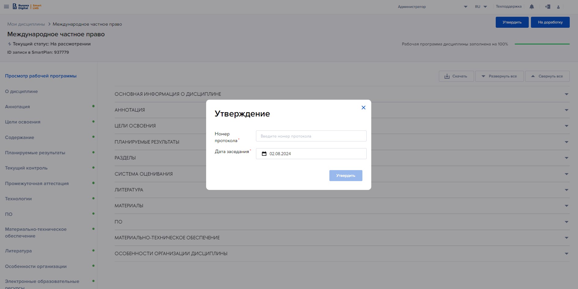 Если Вы являетесь утверждающей стороной – руководителем/менеджером департамента/ОП, Вы можете утвердить РПУД, указав номер протокола и дату заседания, или отправить его на доработку разработчику, указав причину.